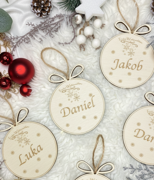 Ob als Namensanhänger, Geschenktag, Christbaumschmuck oder als elegante Ergänzung zur festlichen Deko – diese Holzkugel schafft einen persönlichen Moment, der bleibt.
