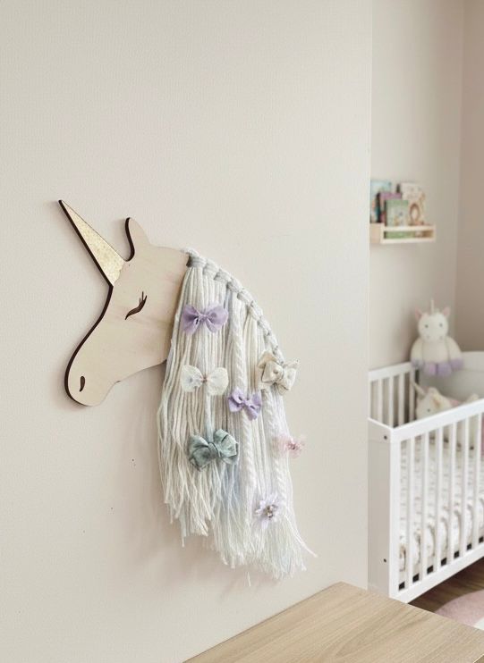 Dieser liebevolle Haarspangenhalter kombiniert dekoratives Design mit nützlicher Aufbewahrung. Das Einhorn besteht aus hochwertigem Holz und hat eine lange, weiche Wollmähne, an der Haarspangen, Schleifen und Haargummis ordentlich befestigt werden können.
