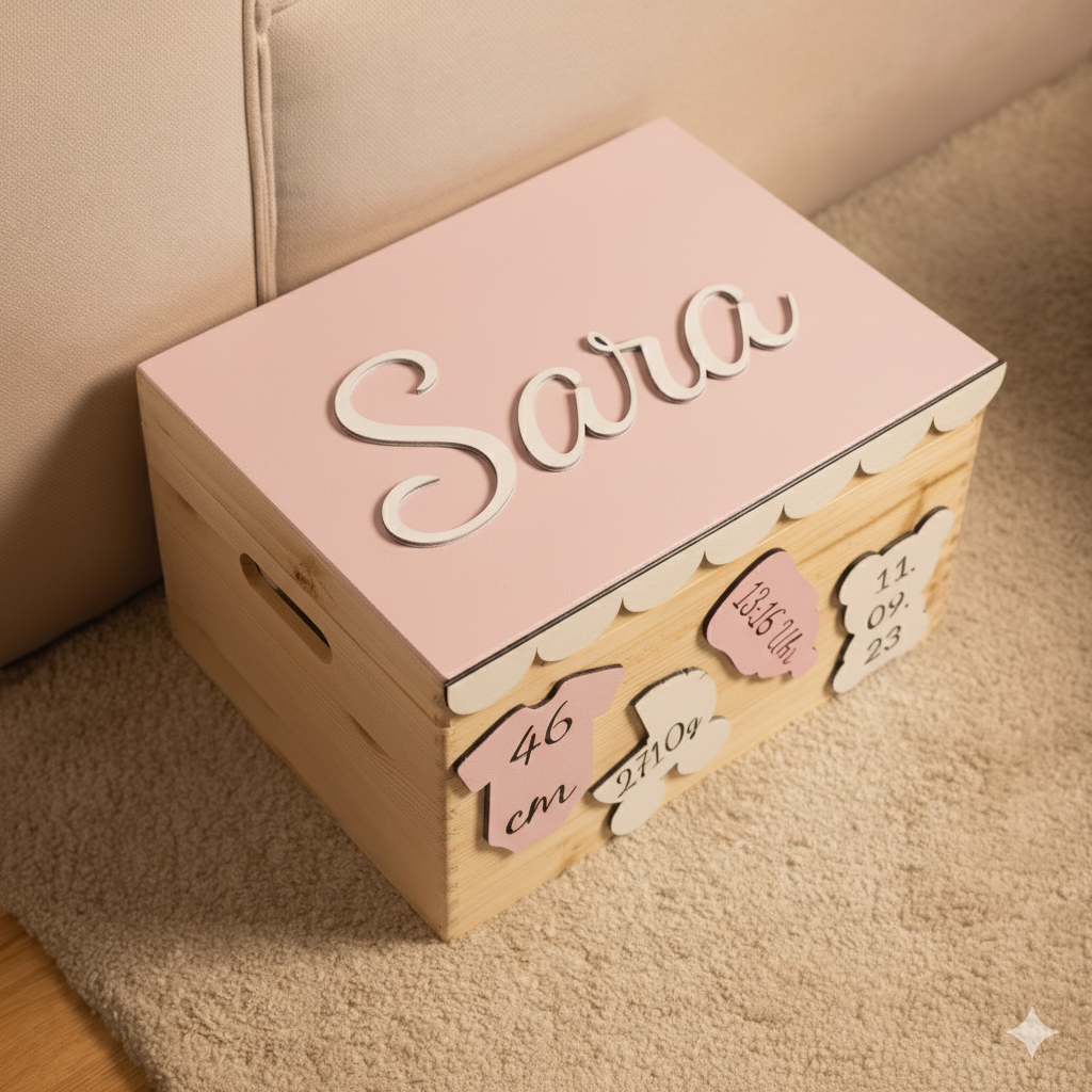 Eine liebevoll gestaltete Holzkiste zur Aufbewahrung der schönsten Erinnerungen an die ersten Lebensmomente deines Kindes.