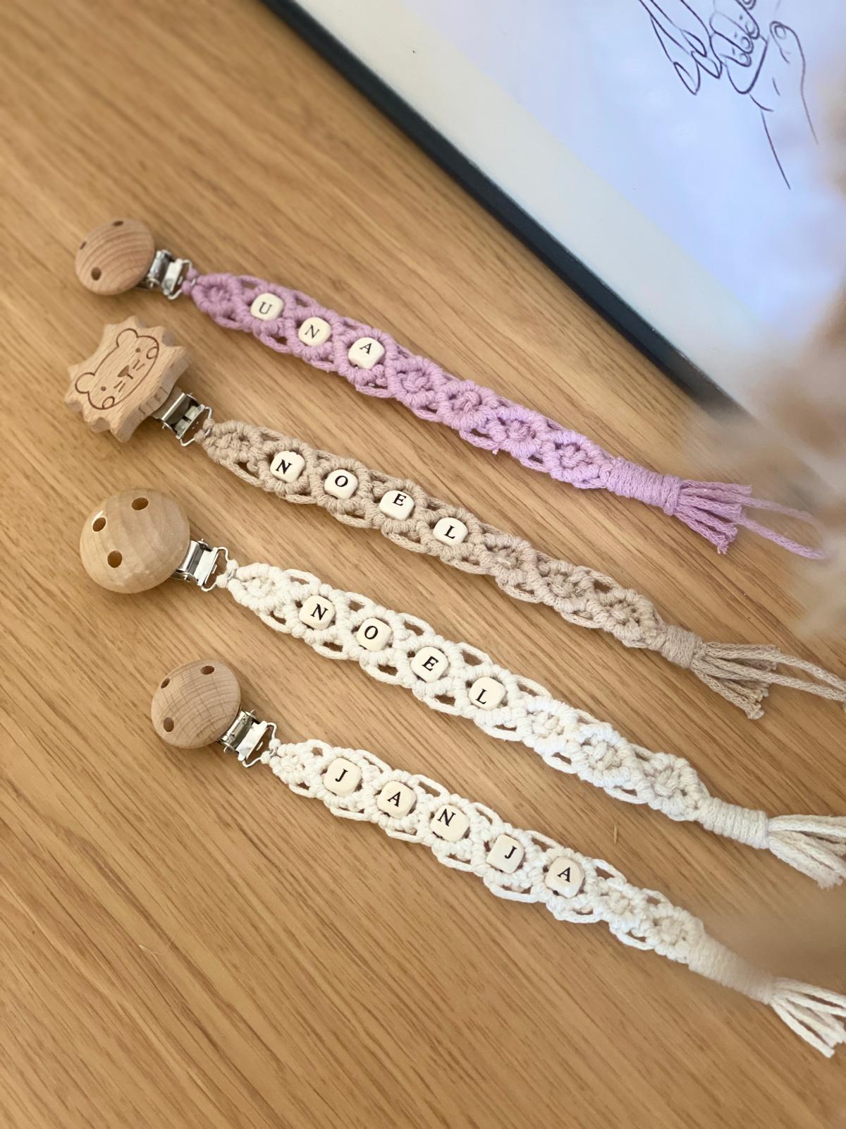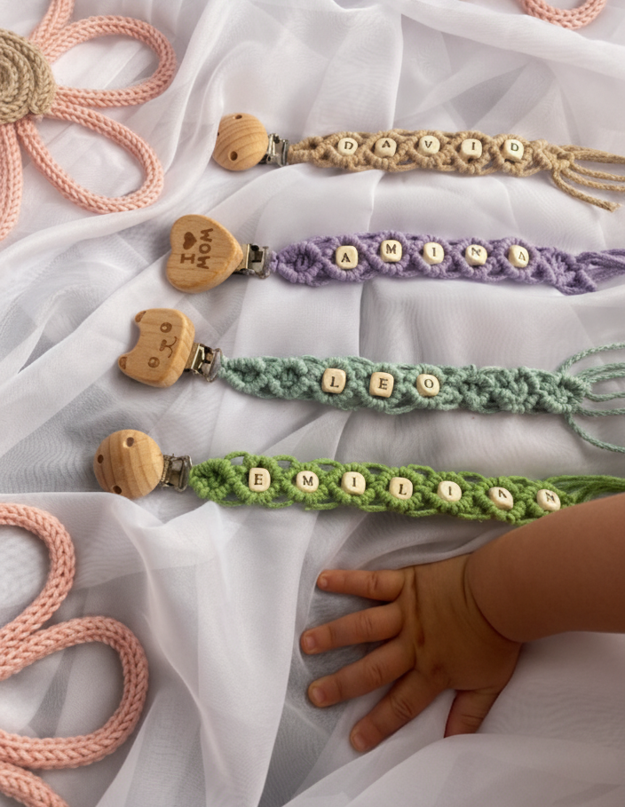 Unsere Makramee-Schnullerketten sind mehr als nur ein praktisches Accessoire – sie sind kleine Erinnerungsstücke, die dich und dein Baby im Alltag begleiten. Jede einzelne Kette wird liebevoll von Hand geknüpft und kann mit dem Namen deines Kindes personalisiert werden. So entsteht ein wunderschönes, individuelles Geschenk zur Geburt, Taufe oder Baby Party.